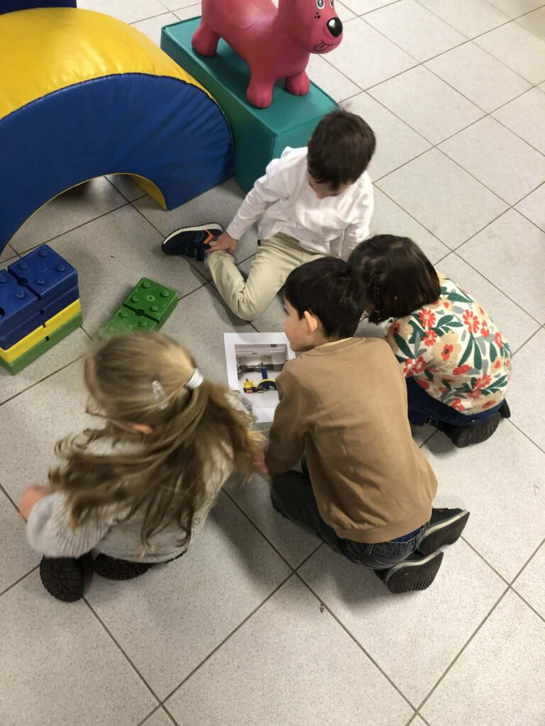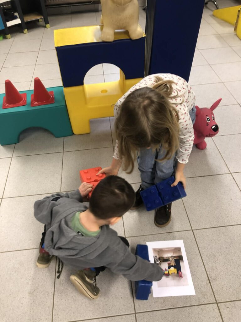Répartis en petits groupes, les élèves ont d’abord eu pour mission de créer une construction géométrique originale. Ils disposaient de matériel simple (formes, bâtonnets, blocs, etc.) et d’une seule consigne : laisser libre cours à leur imagination tout en veillant à ce que la construction soit reproductible.