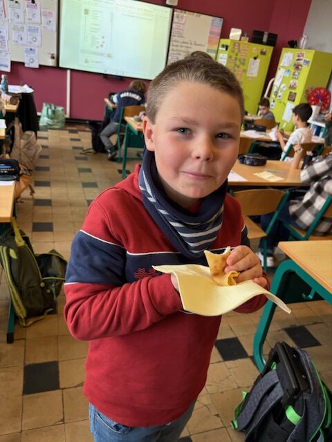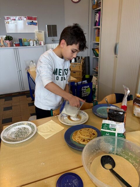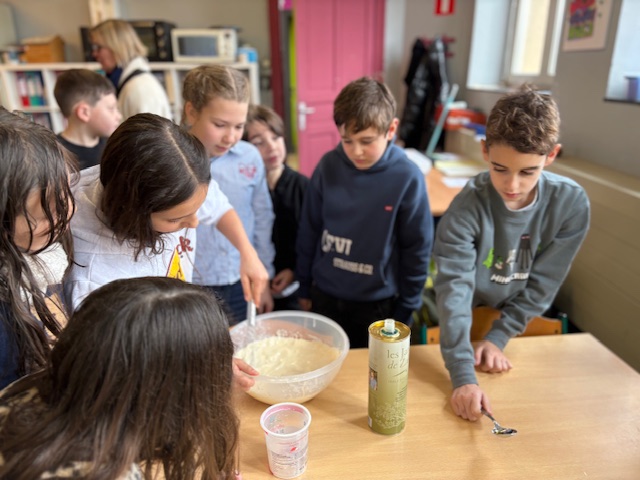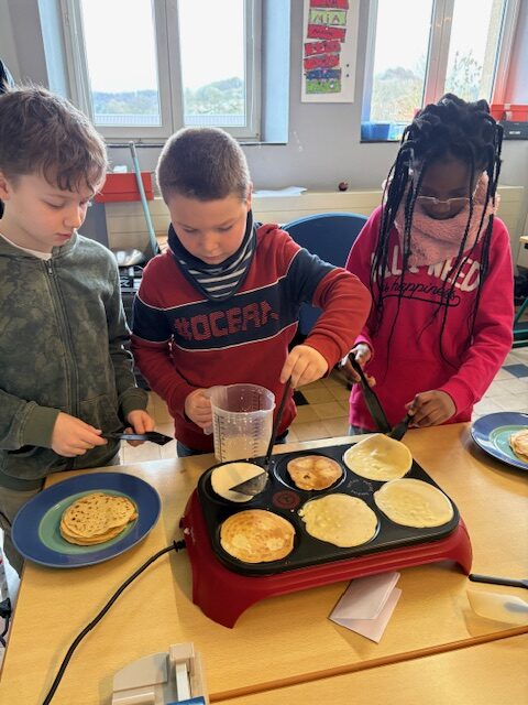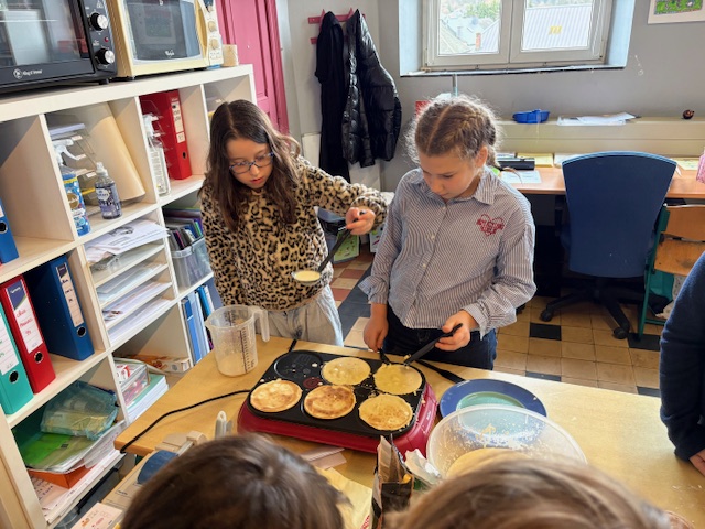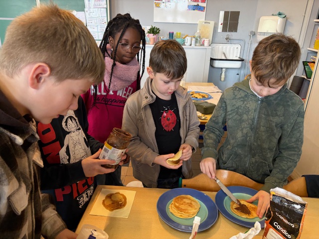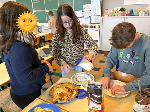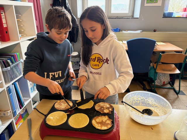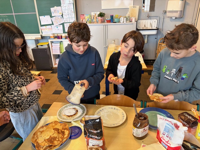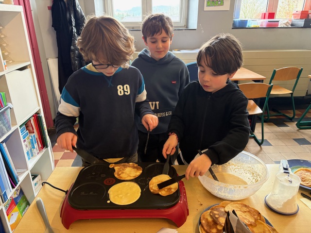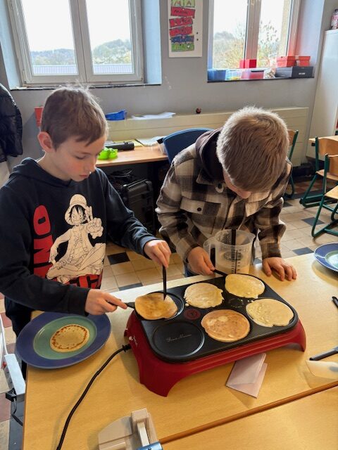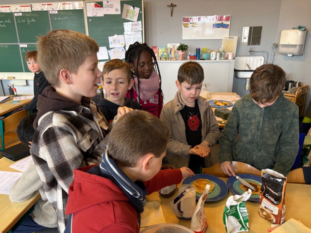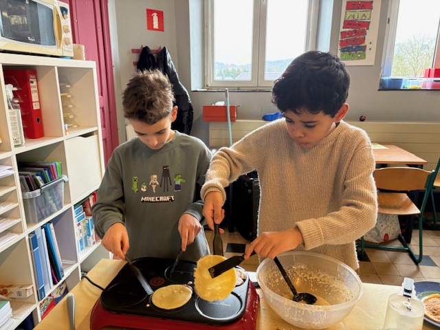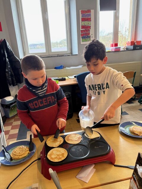 Cette semaine, les élèves de P4 ont célébré la Chandeleur de la plus délicieuse des manières. Au programme : un atelier pâtisserie qui a rencontré un franc succès. Les enfants ont enfilé leur tablier, retroussé leurs manches et se sont transformés en véritables petits chefs. La pâte, les ustensiles, les gestes précis… rien ne leur a échappé. La pâtisserie n’a désormais plus aucun secret pour eux.