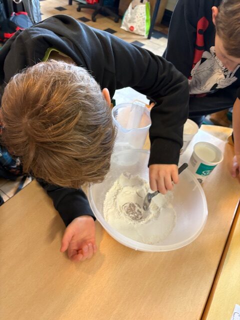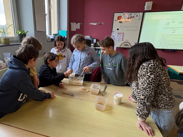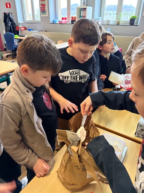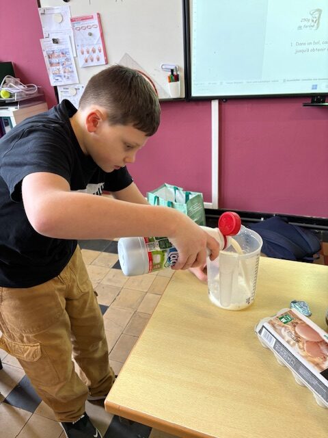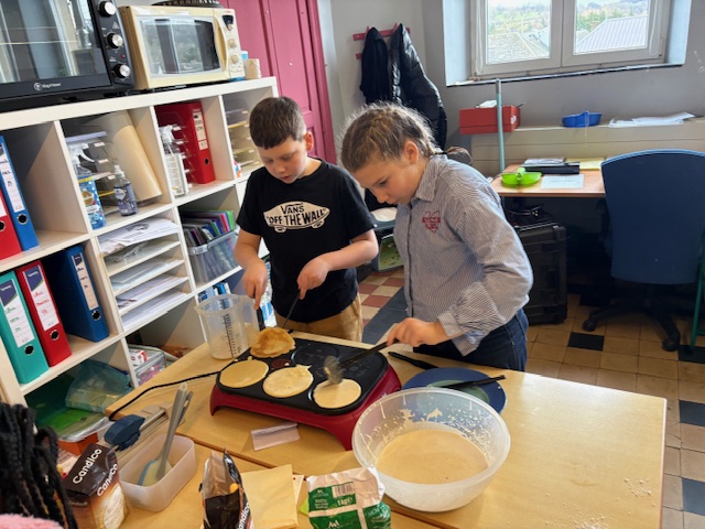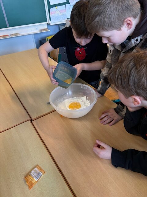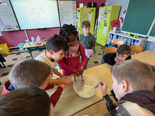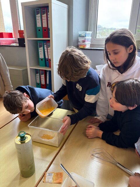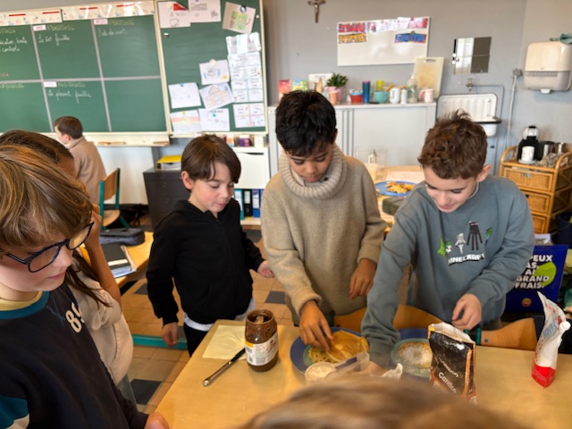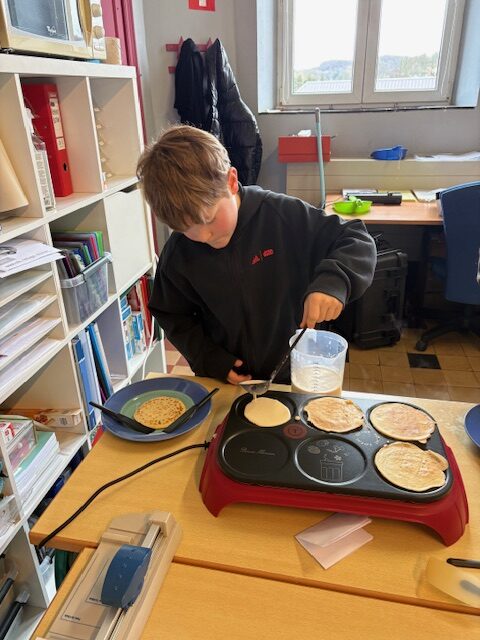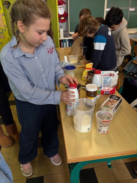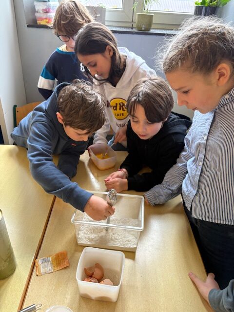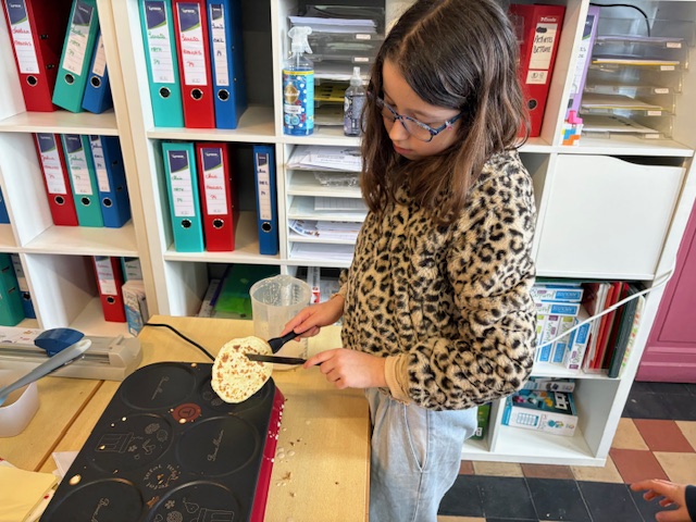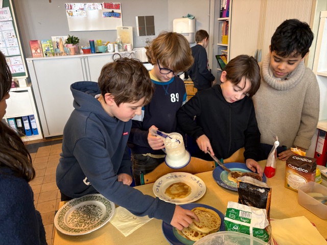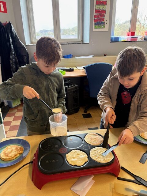 Cette semaine, les élèves de P4 ont célébré la Chandeleur de la plus délicieuse des manières. Au programme : un atelier pâtisserie qui a rencontré un franc succès. Les enfants ont enfilé leur tablier, retroussé leurs manches et se sont transformés en véritables petits chefs. La pâte, les ustensiles, les gestes précis… rien ne leur a échappé. La pâtisserie n’a désormais plus aucun secret pour eux.
