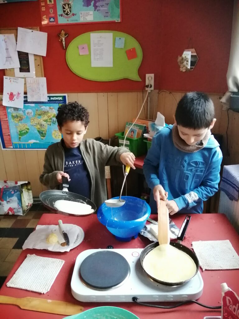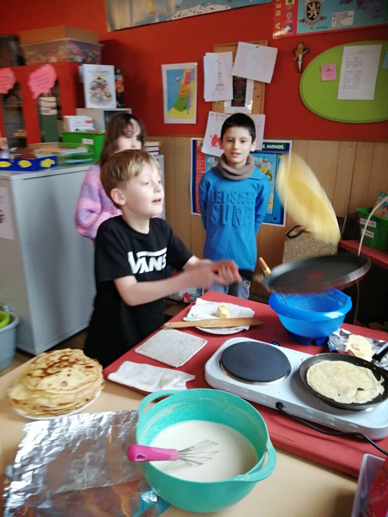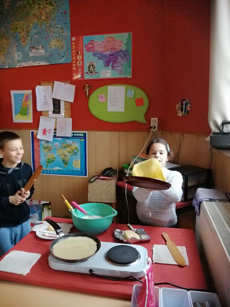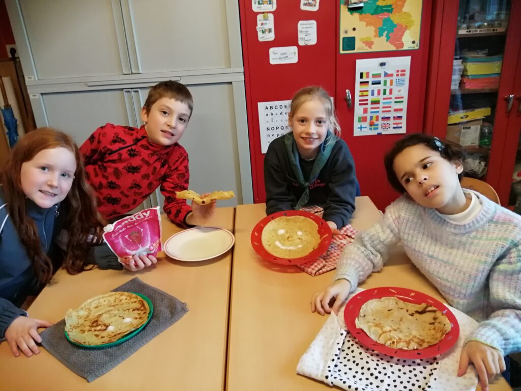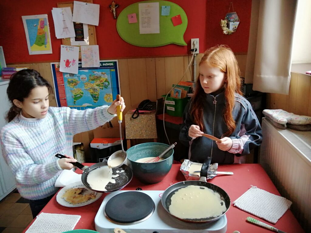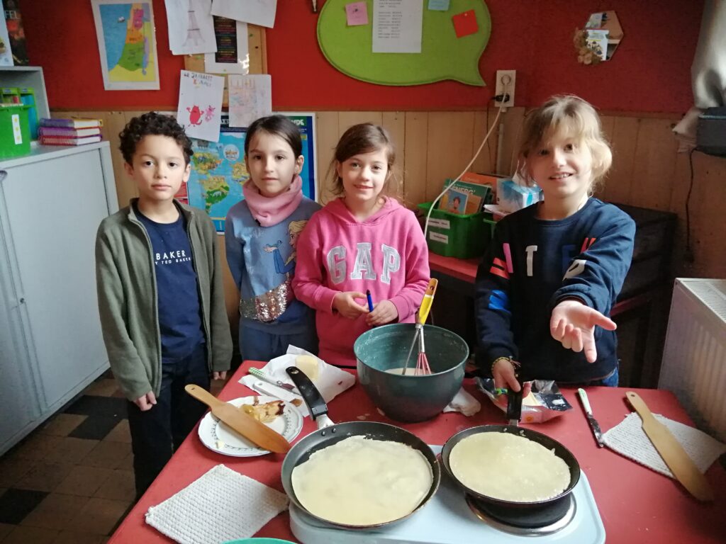 Durant la première semaine de février, les élèves de 3e année ont célébré la Chandeleur comme il se doit : avec curiosité, bonne humeur… et de délicieuses crêpes !
