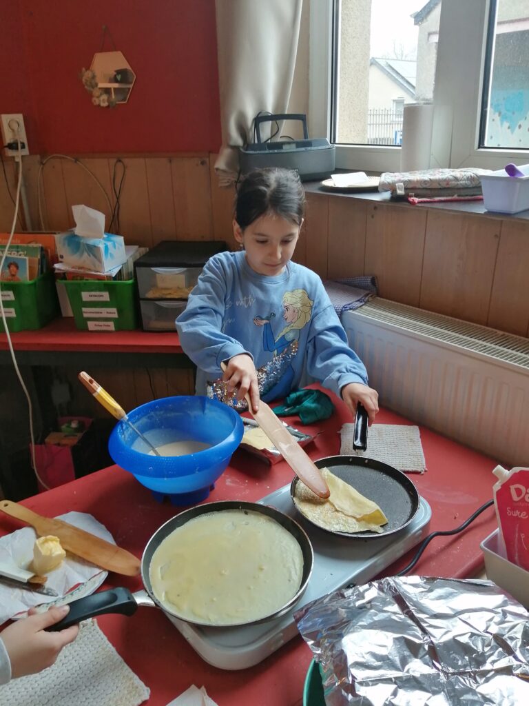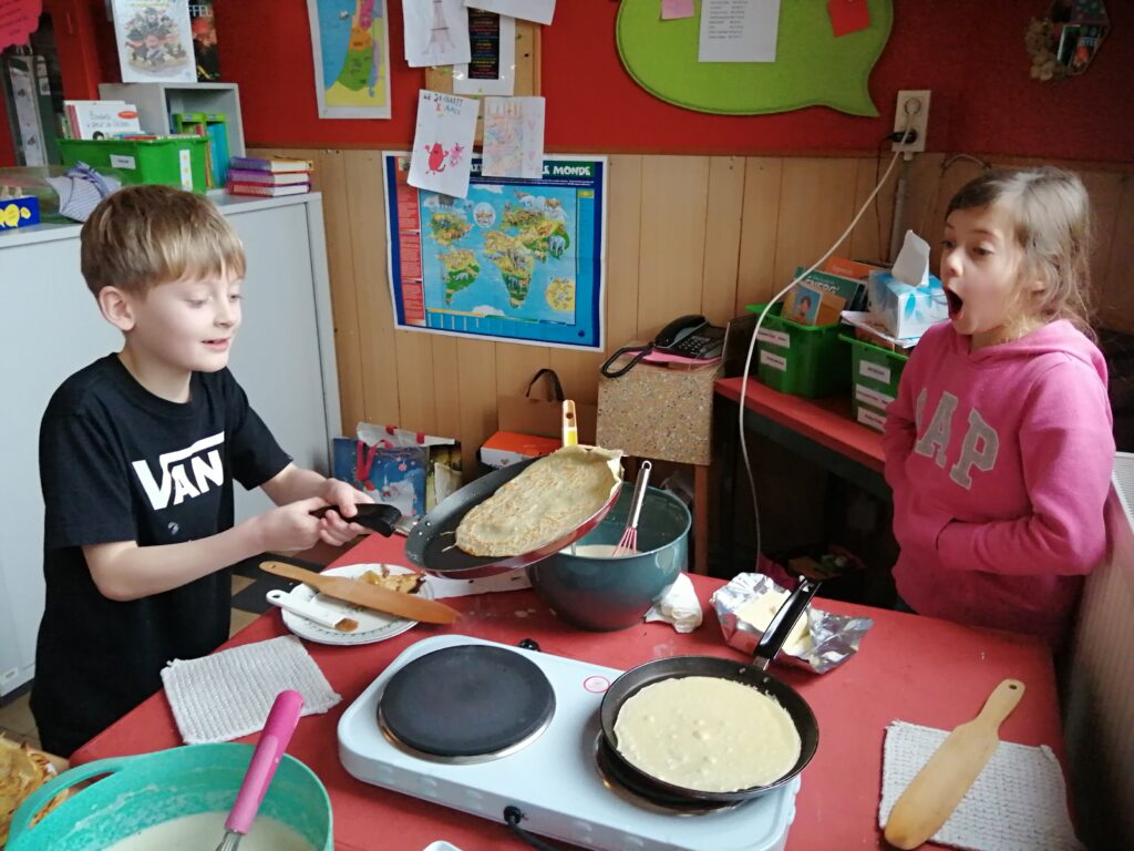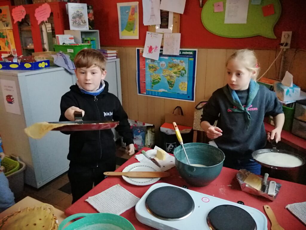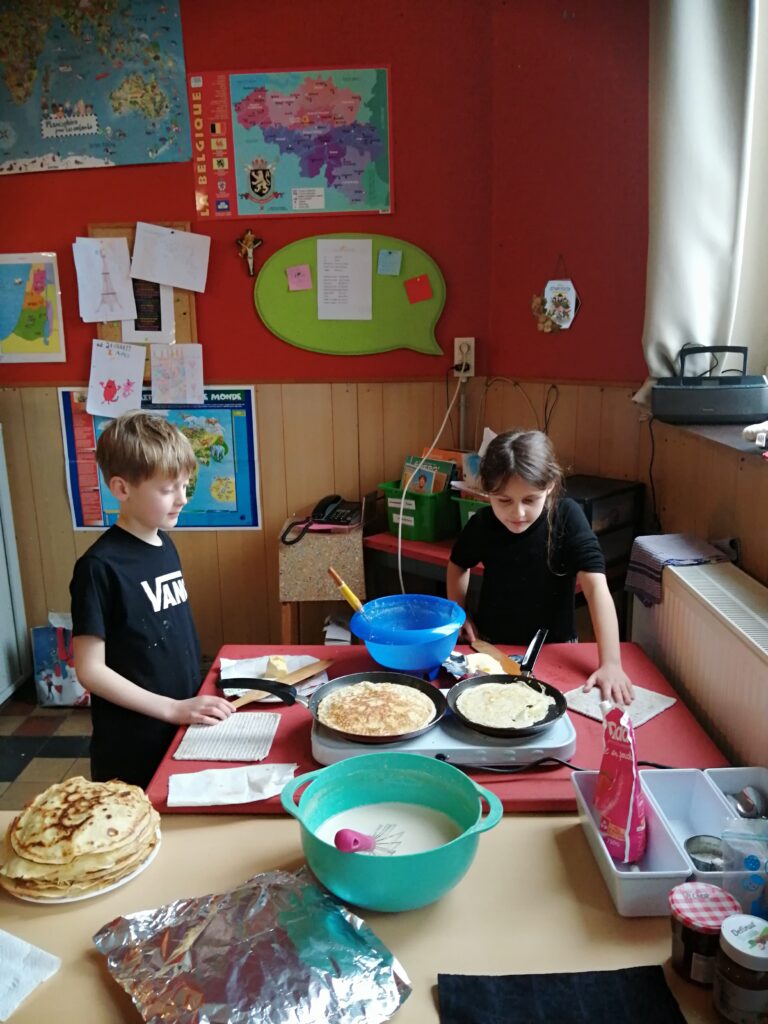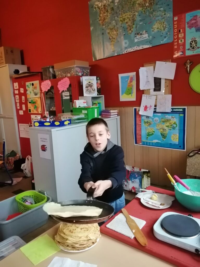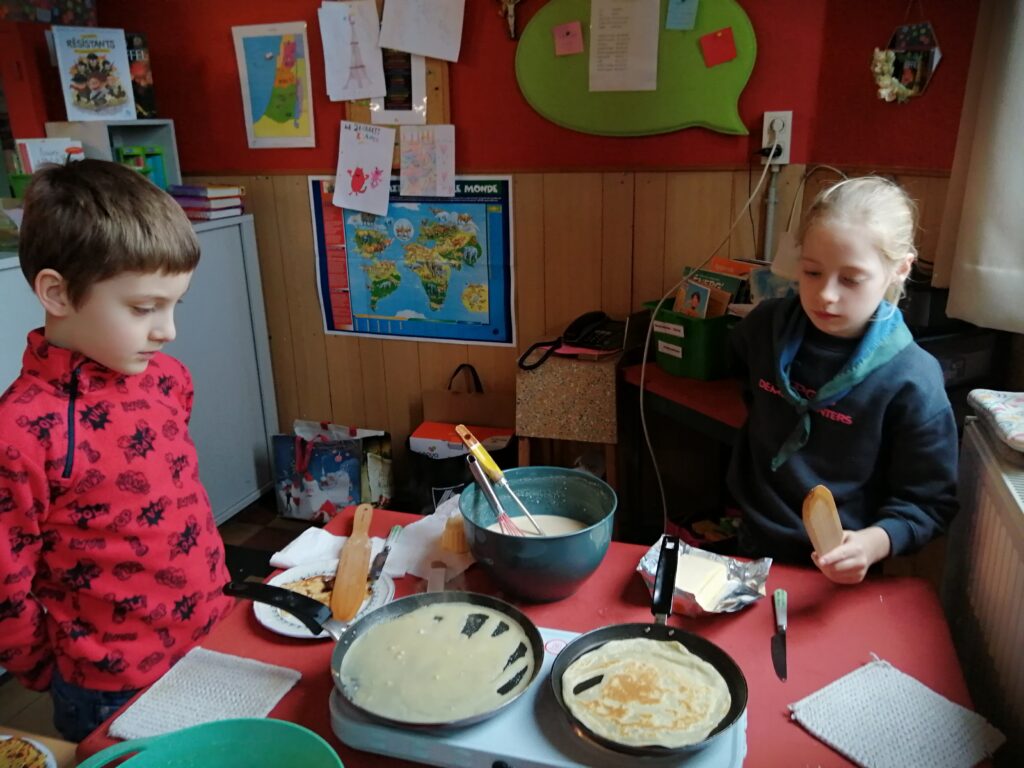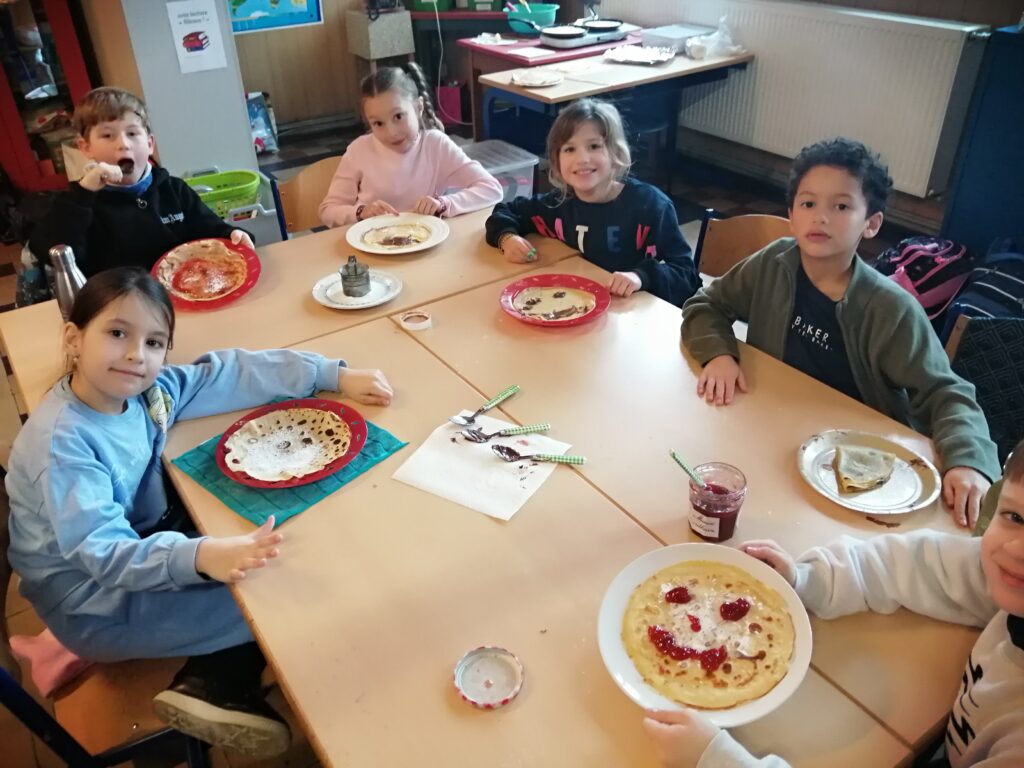 Durant la première semaine de février, les élèves de 3e année ont célébré la Chandeleur comme il se doit : avec curiosité, bonne humeur… et de délicieuses crêpes !
