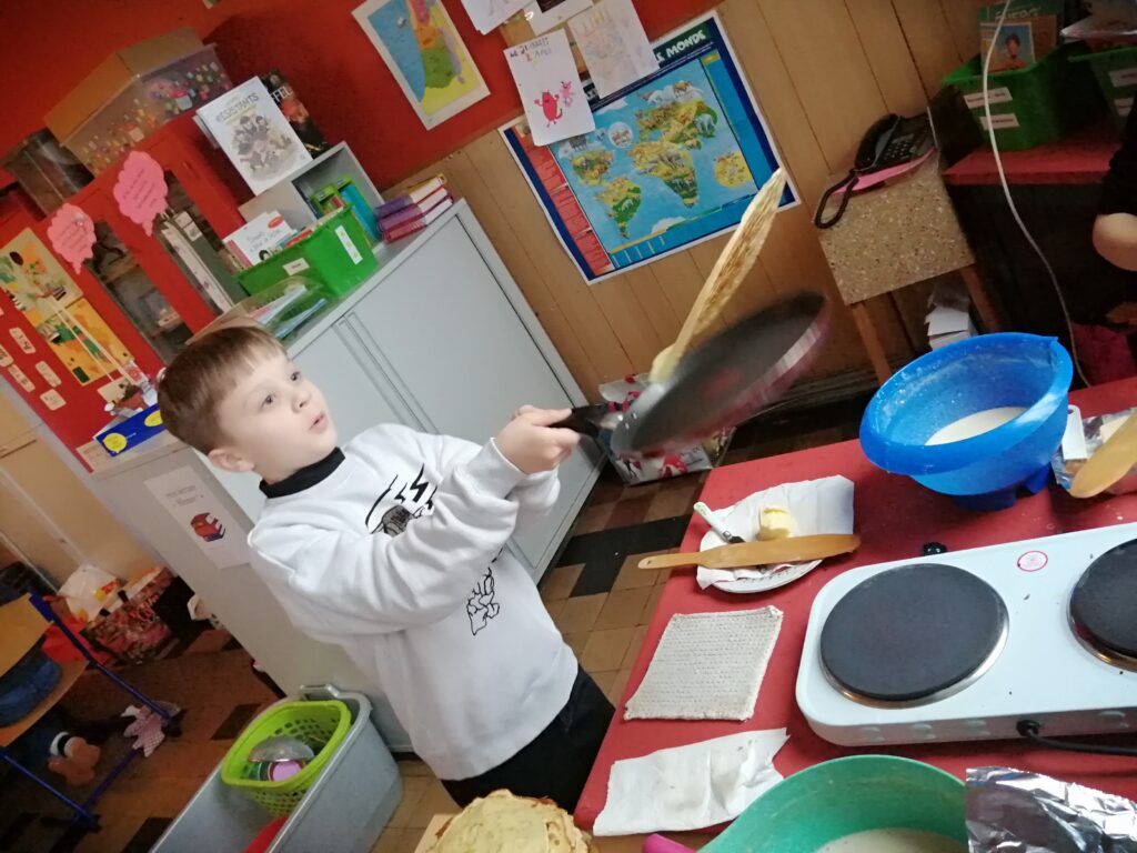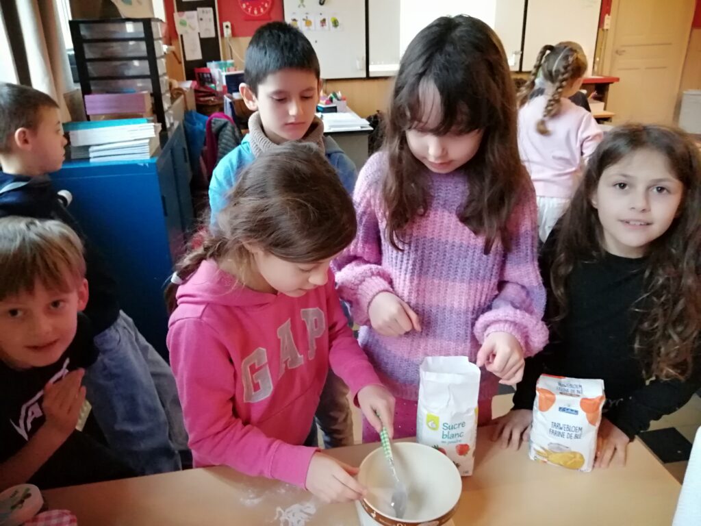 La journée a commencé par la découverte des origines de cette fête traditionnelle et des coutumes qui l’accompagnent depuis des siècles. Après ce petit voyage dans le temps, place à la pratique ! Les enfants ont enfilé leur tablier et ont mis la main à la pâte pour préparer la recette qui allait régaler toute la classe en fin de journée.